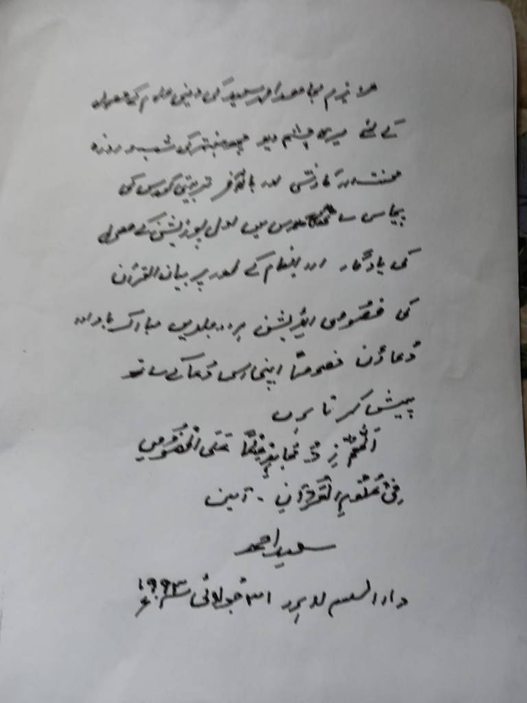 58. And the inscription above—it appears inside a copy of the deluxe edition of Bayan-ul-Quran—also bearing the handwriting of Doctor Saeed Ahmad, and was gifted to his grandson, Mujahid Ahmad Saeed, on securing the first position in annual Tarbiyati (Ahmadiyya Educational) Course.